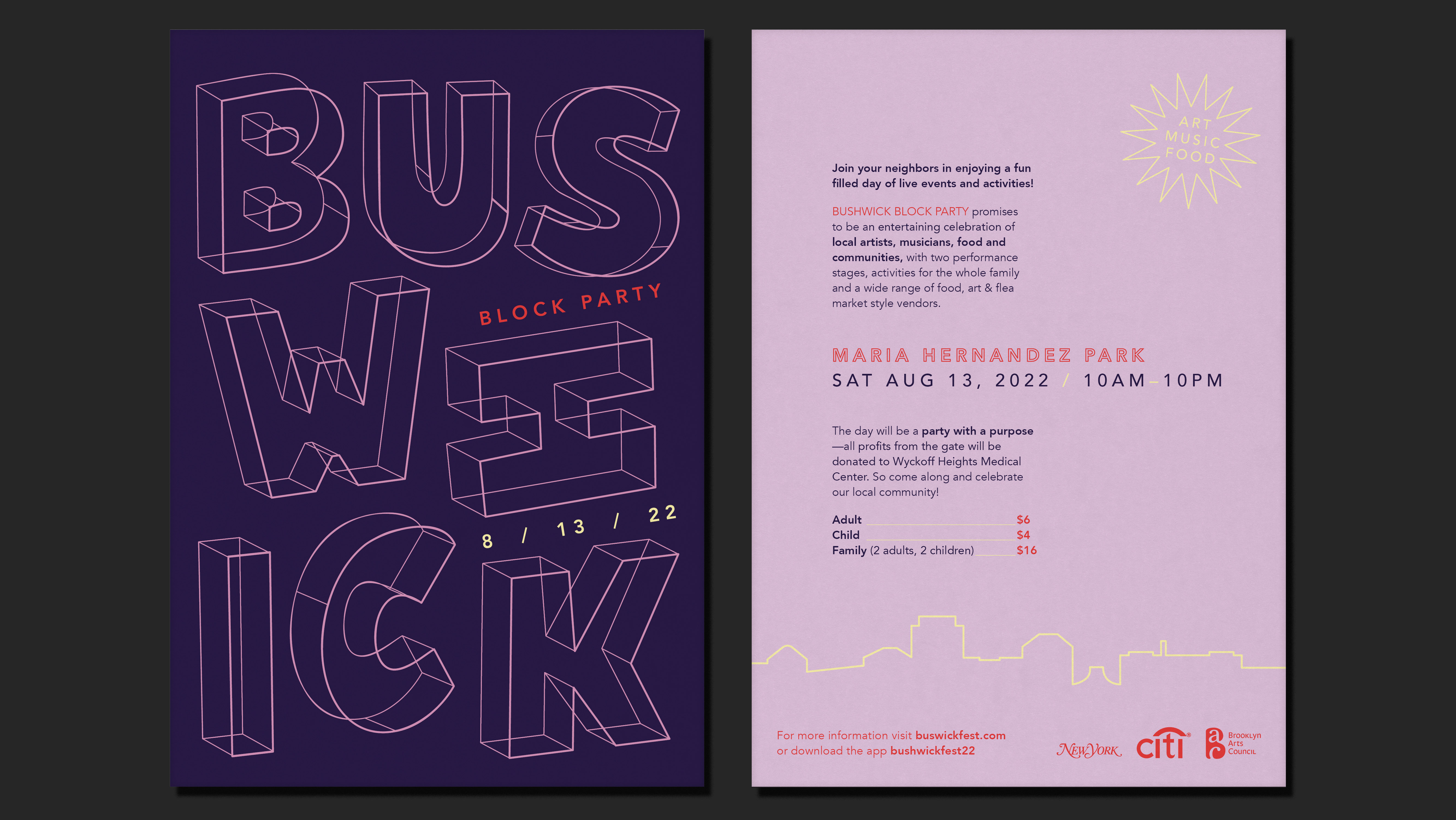 A bespoke typographic flyer for Bushwick Block Party, using custom three-dimensional lettering and a dual-colour palette to reflect the area’s street culture and day-to-night energy.