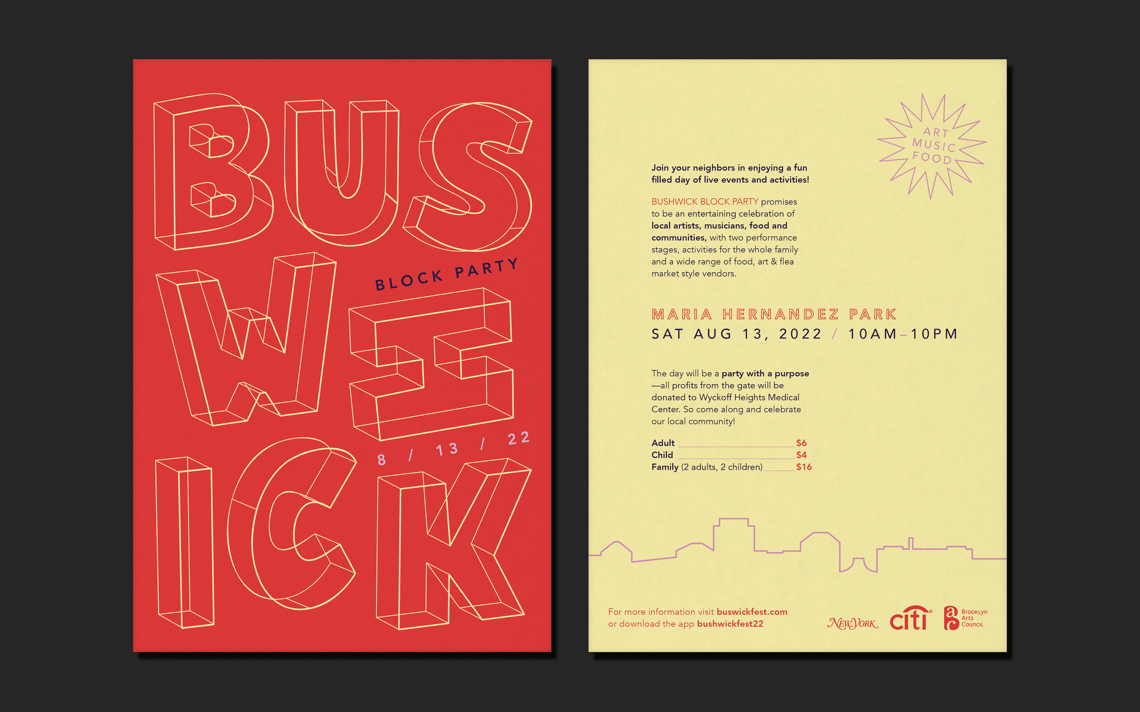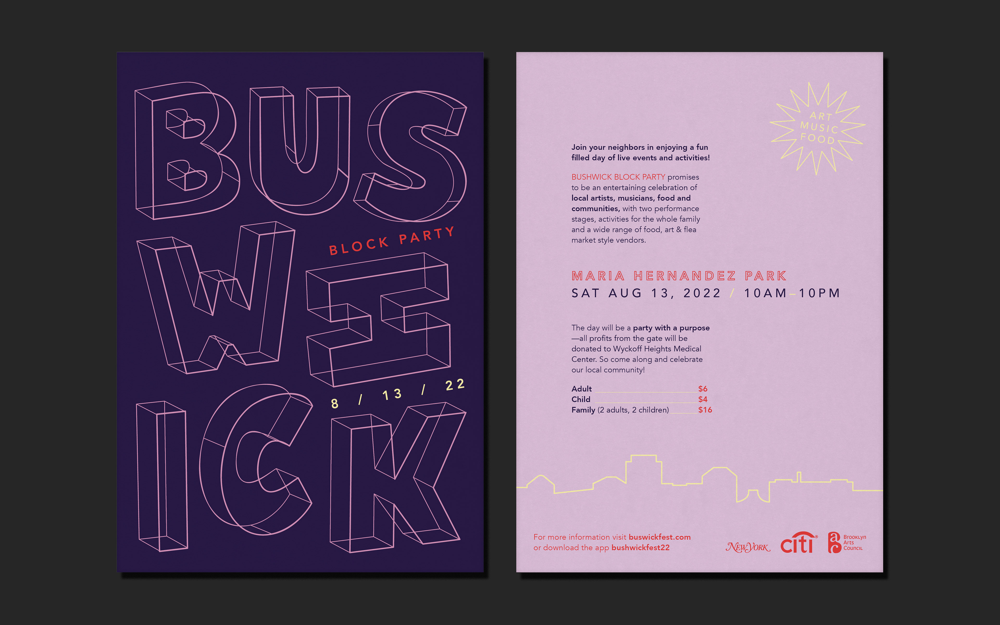 The brief was to design a promotional flyer for the festival’s final-day block party. A bespoke custom-drawn typographic lockup was developed to create a bold, expressive identity inspired by Bushwick’s architecture and street culture. A dual-colour palette reflects the shift from daytime community celebration to evening music and nightlife.